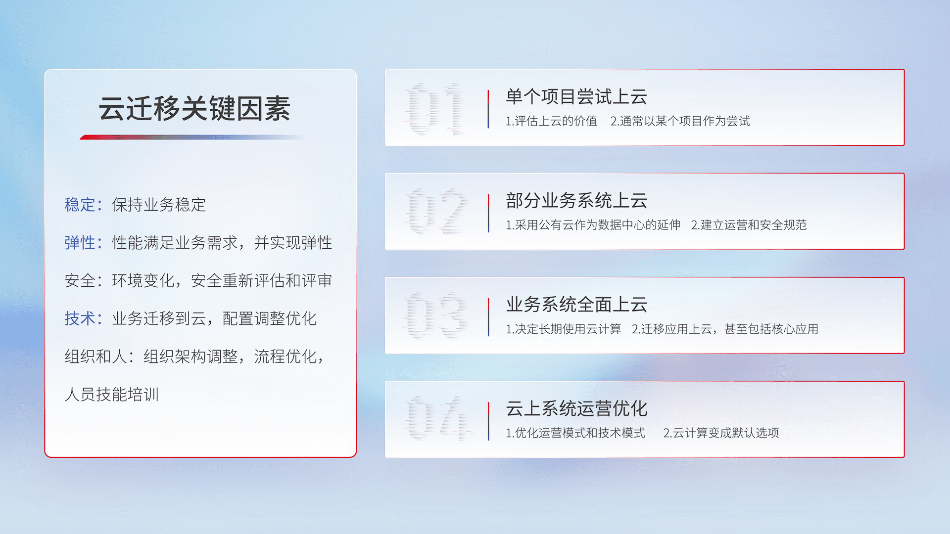结合实际业务,,,从规划设计、、、云平台选型、、、云原生改造、、、、数据迁移、、、、集成交付,,迁移全过程为客户识别最佳上云路径,,,做好风险识别管理,,设计网络架构、、、、身份权限、、、安全审计合规、、、操作审计、、日志审计、、监控告警策略、、多站点容灾设计等,,对云上基础设施进行整体规划,,提升IT治理水平,,,以满足弹性、、高可用、、、高性能的需求。。。