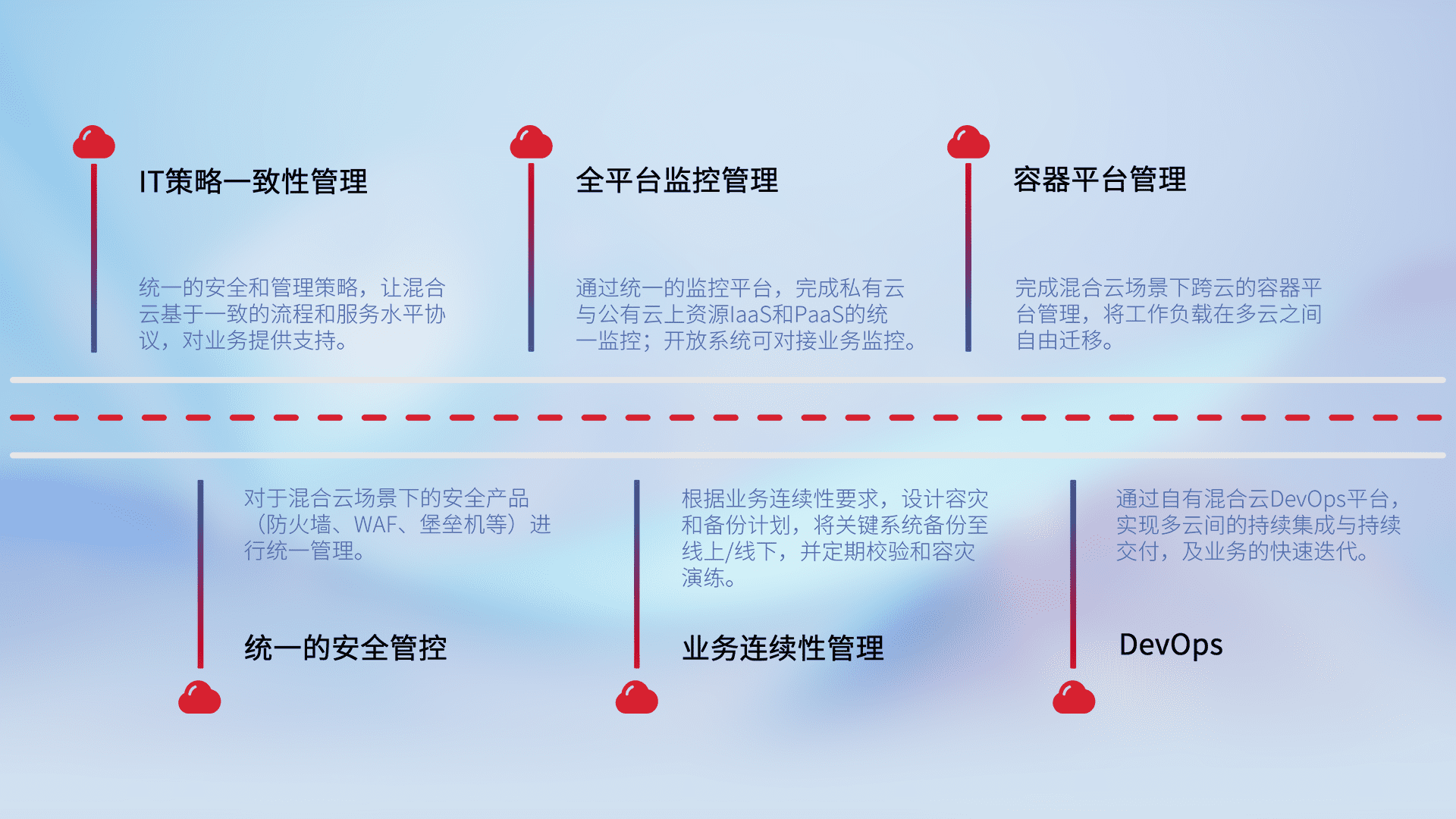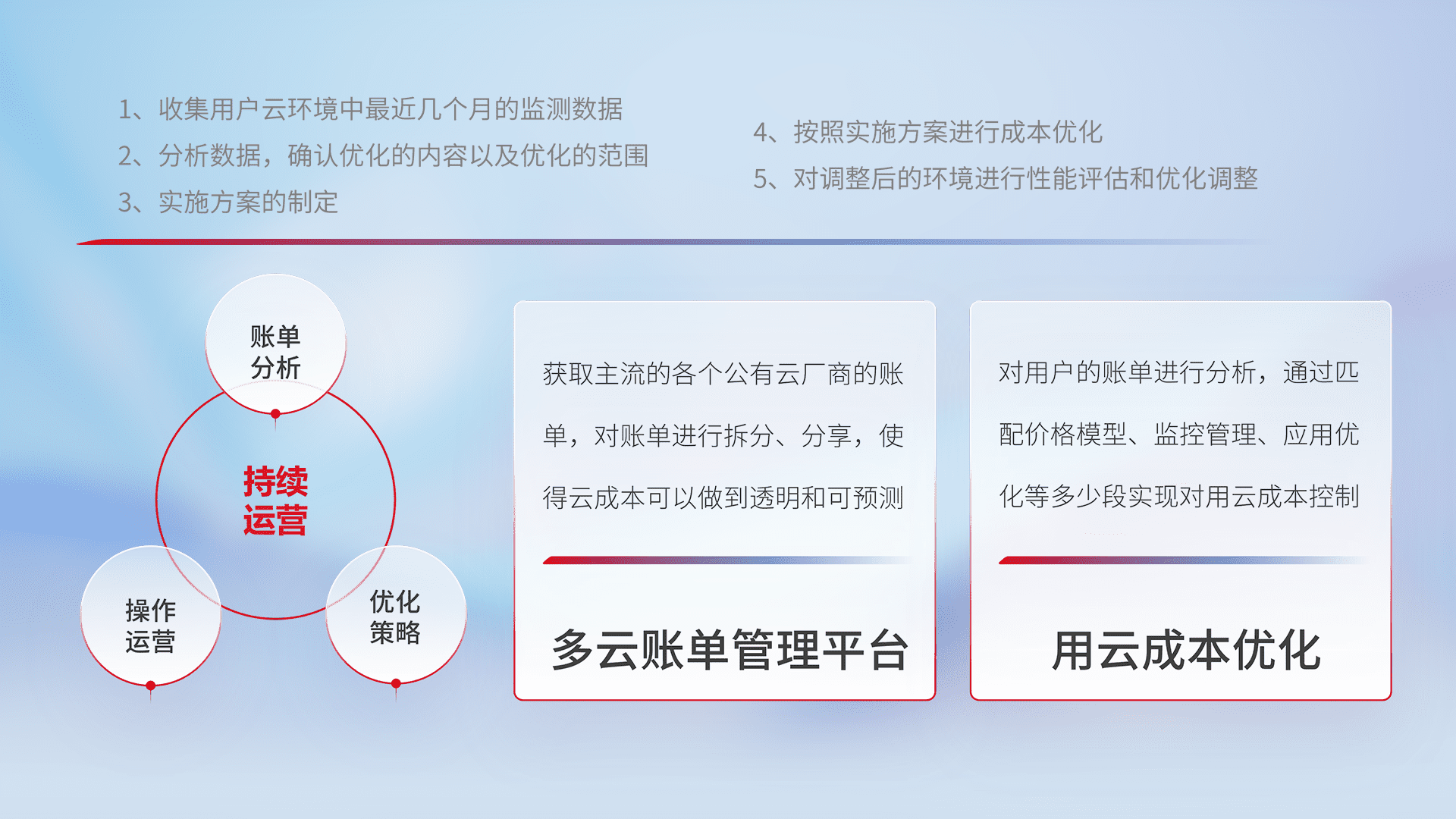 通过多云纳管,,以统一的资源数据模型把客户的云资源进行抽象和封装,,进而实现对多云资源的统一操作,,,保障云资源管理的可靠性、、稳定性与可用性。。。量身定制化运维内容,,,,配置、、、、开发运维、、补丁管理、、备份、、监控、、认证和访问管理、、、审计和日常巡检等,,,保障在用云过程中的可靠度,,,,稳定度以及高可用率。。