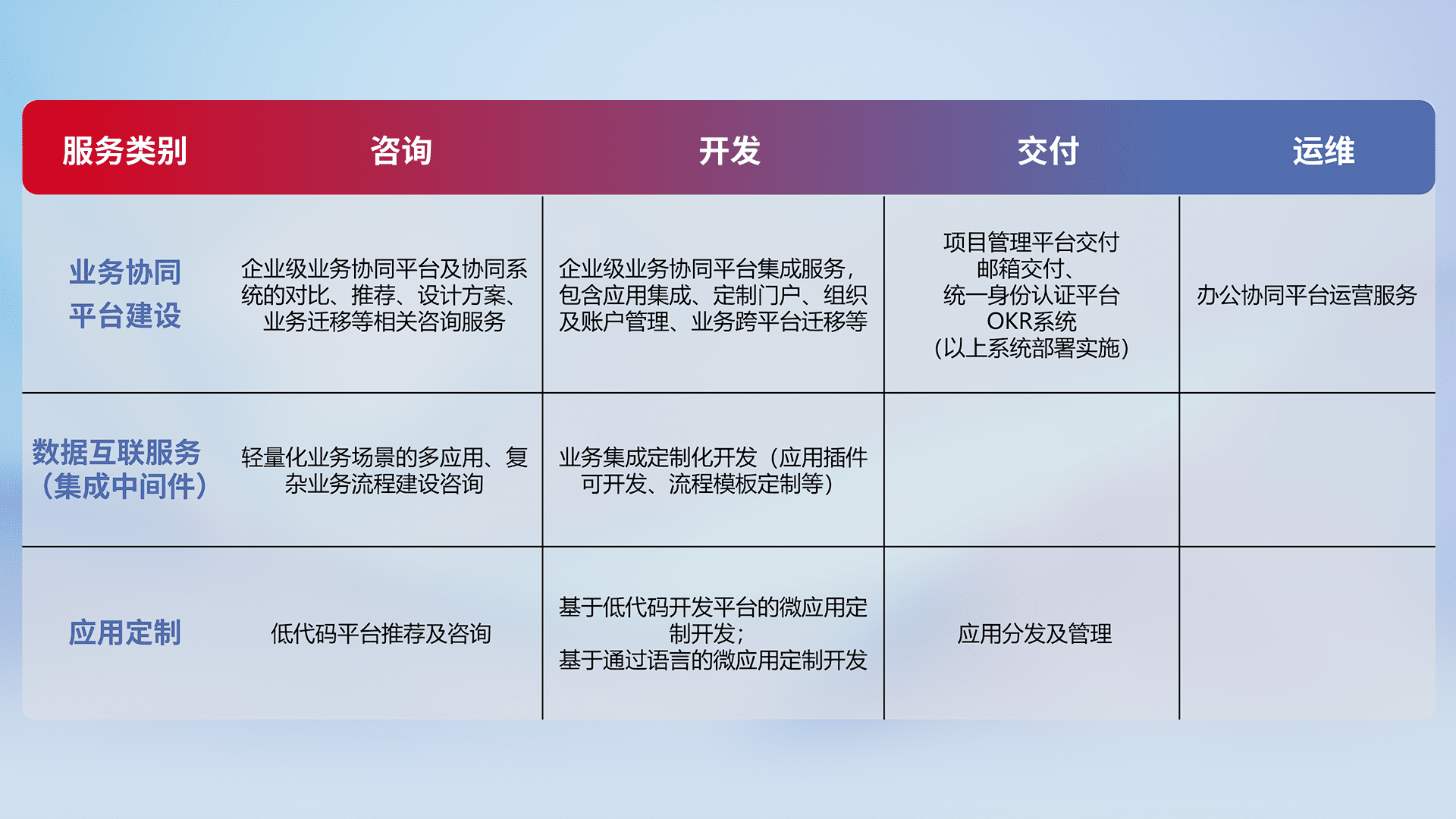 针对钉钉、、、企微、、、IDaas等平台级产品提供产品的规划、、方案、、、交付、、定制化开发等服务,,实现如统一协同办公、、智能客户服务、、、、混合会议管理、、、、智能数据查询、、、等业务场景,,实现数字化转型。。。